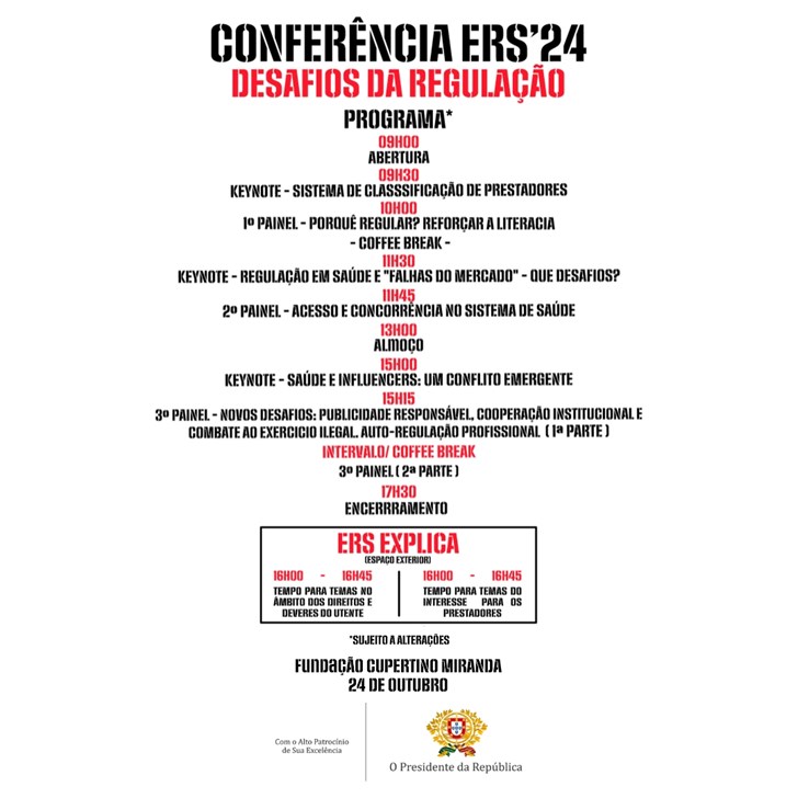 A Entidade Reguladora da Saúde (ERS) tem o prazer de anunciar a organização da Conferência ERS’24, subordinada ao tema "Desafios da Regulação". O evento decorrerá na Fundação Cupertino de Miranda, no Porto, no dia 24 de outubro de 2024, e será uma oportunidade para discutir os principais desafios regulatórios no setor da saúde.