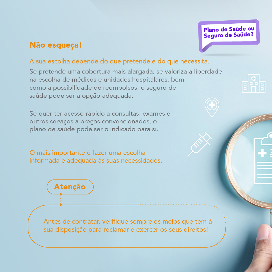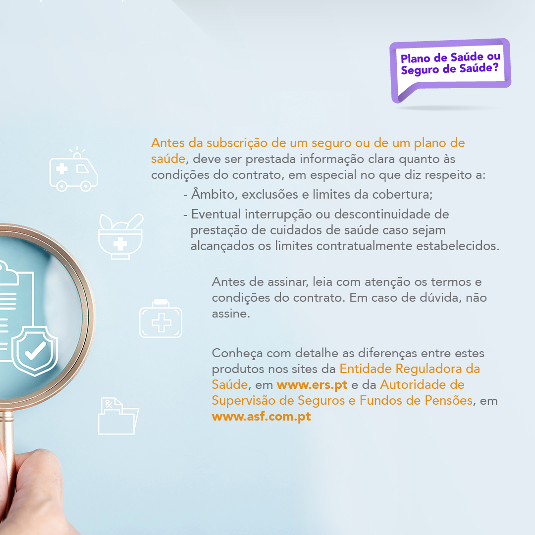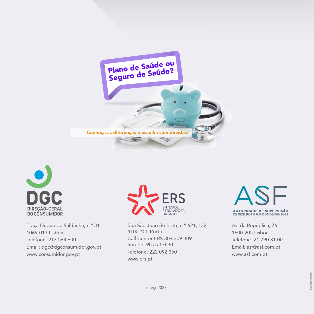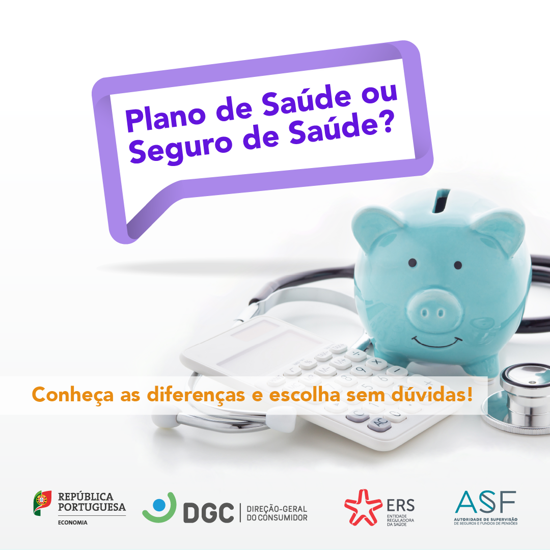 Para o ajudar nessa escolha, a Direção-Geral do Consumidor (DGC), a Entidade Reguladora da Saúde (ERS) e a Autoridade de Supervisão de Seguros e Fundos de Pensões (ASF) lançaram a campanha : « Plano de Saúde ou Seguro de Saúde? Conheça as diferenças e escolha sem dúvidas!».