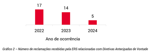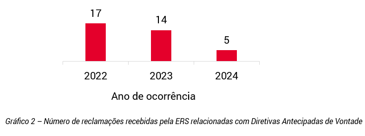 Os números quer de reclamações, quer de pedidos de informação (cfr. gráfico n.º 2 e gráfico n.º 3) rececionados pela ERS ilustram a necessidade de reforçar, junto dos utentes, prestadores de cuidados de saúde e demais agentes com intervenção, direta ou indireta, no sistema de saúde, a literacia sobre diretivas antecipadas de vontade.