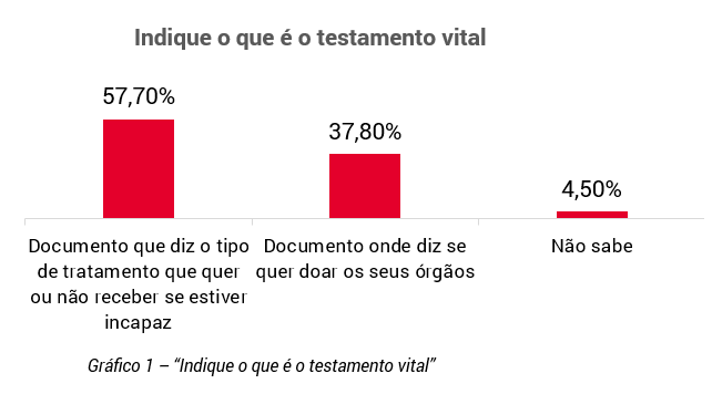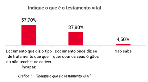 Primeiramente, foi realizada uma pergunta de autoavaliação e, nessa sequência, perguntou-se “O que é o testamento vital?”, tendo 57,7% dos respondentes selecionado a resposta correta (“Documento que diz o tipo de tratamento que quer ou não receber se estiver incapaz”) (cfr. gráfico 1). No entanto, os 67,1% dos utentes inquiridos que tinham afirmado, na autoavaliação, não ter nenhum conhecimento sobre o testamento vital foram retirados desta questão pelo que, se se considerar estes como tendo conhecimento inadequado, contatou-se que apenas 19% do total de utentes sabia efetivamente o que é o testamento vital.