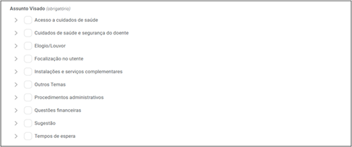 A especificação do assunto (2.º nível) é obrigatória. O sistema permite a seleção de mais do que um tema e, dentro de cada tema, de mais do que um assunto.